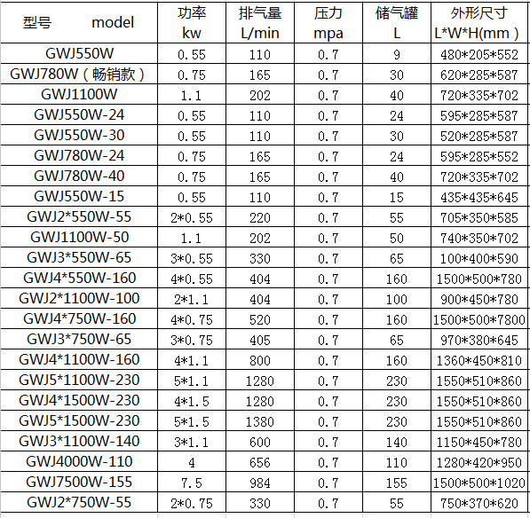 無油靜音空氣壓縮機性能參數: